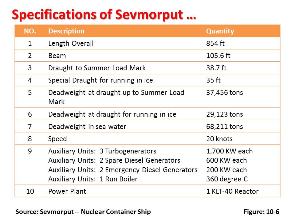Since the commissioning of Sevmorput in December 31, 1988, it has made 302,000 miles, carried more than 1.5 million tons of cargo. It is a 61,900 tonne 260 m long, LASH-carrier (taking lighters to ports with shallow water) and container ship with ice-breaking bow. It is powered by the same KLT-40 reactor as used in larger icebreakers, delivering 32.5 propeller MW from the 135 MWt reactor and it needed refueling only once to 2003.
