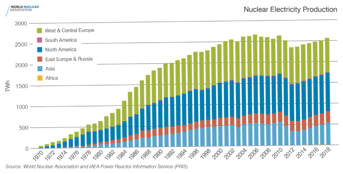 Nuclear reactors generated a total of 2563 TWh of electricity in 2018, up from 2502 TWh in 2017. This is the sixth successive year that nuclear generation has risen, with output 217 TWh higher than in 2012: