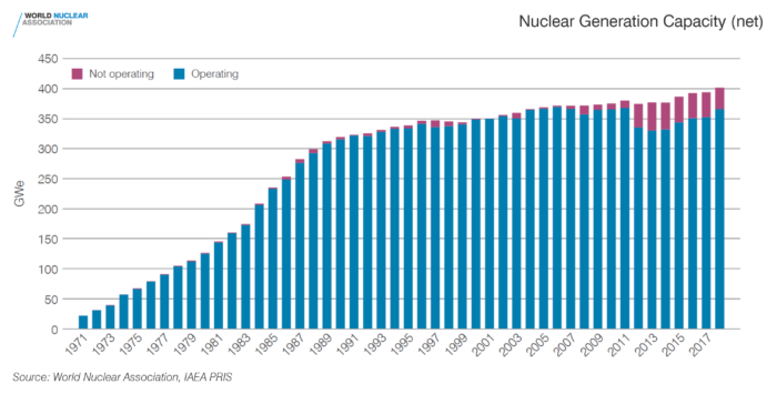 Usually only a small fraction of operable nuclear capacity does not generate electricity in a calendar year. However, since 2011, the majority of the Japanese reactor fleet has been awaiting restart. Four Japanese reactors were restarted in 2018, joining the five reactors that had restarted in previous years: