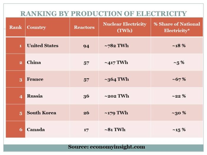 The following table is designed to demonstrate that in 2025, Canada was the sixth country in the world for using 17 reactors to produce 81 TWh (Terawatt-hour is a unit of electrical energy equals to one trillion watt-hours):