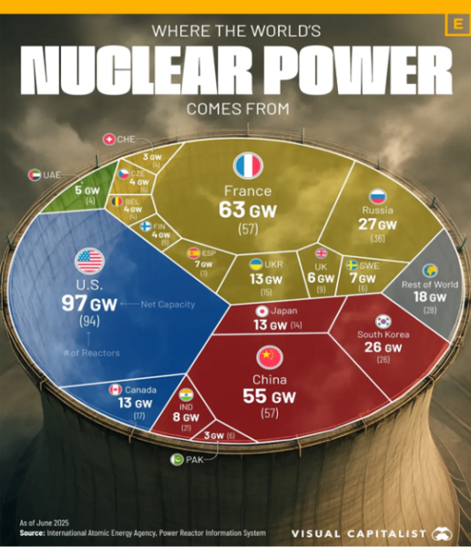 Here is the image to illustrate that in 2025, Canada produced 13 GW (Gigawatt – A unit of power that equals one billion watts or 1,000 megawatts) nuclear power with 17 reactors: